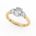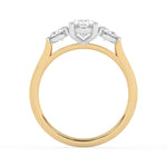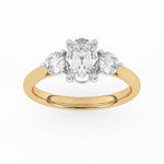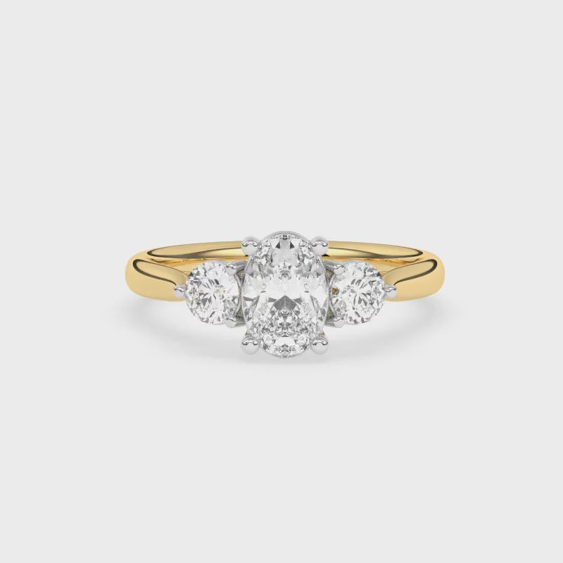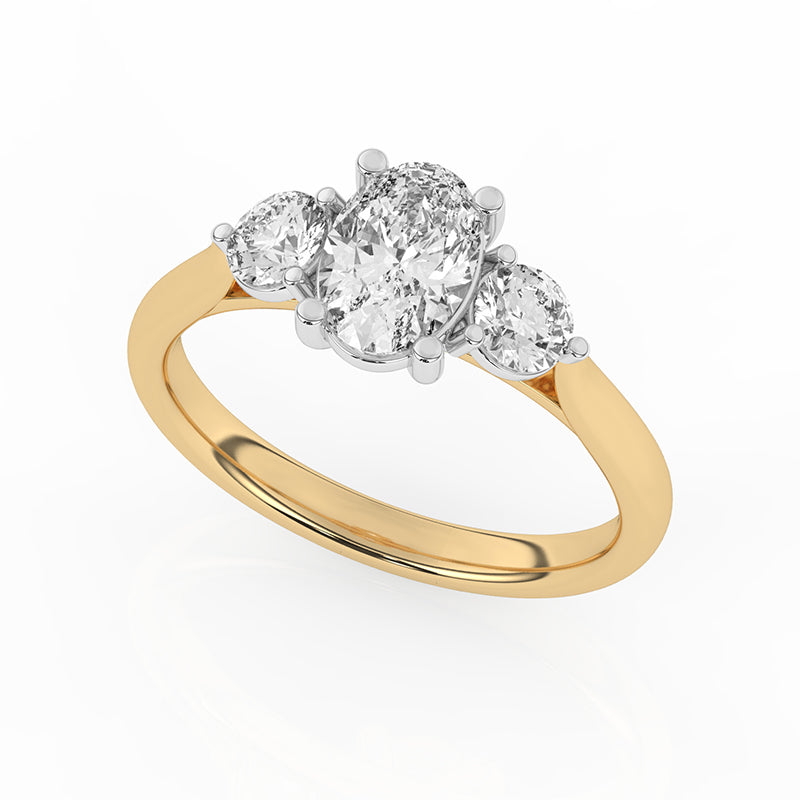 Description: Diamond Three Stone Ring, Set with Oval Cut Lab Diamond & Two Brilliant Cut Lab Diamonds, Set in 9ct or 18ct Yellow Gold