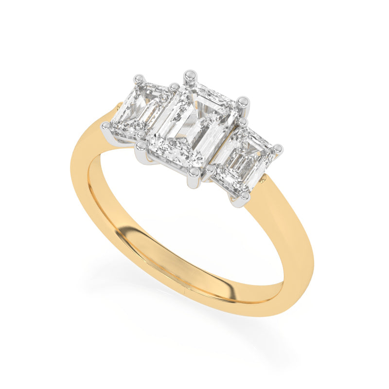 Diamond Three Stone Ring, Set with Lab Grown Emerald Cut Diamonds, Set in 9ct or 18ct Yellow Gold