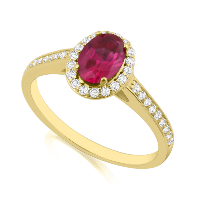 Description: Diamond & Ruby Halo Ring, Set with Round Cut Ruby & Brilliant Cut Diamonds, Set in 9ct or 18ct Yellow Gold