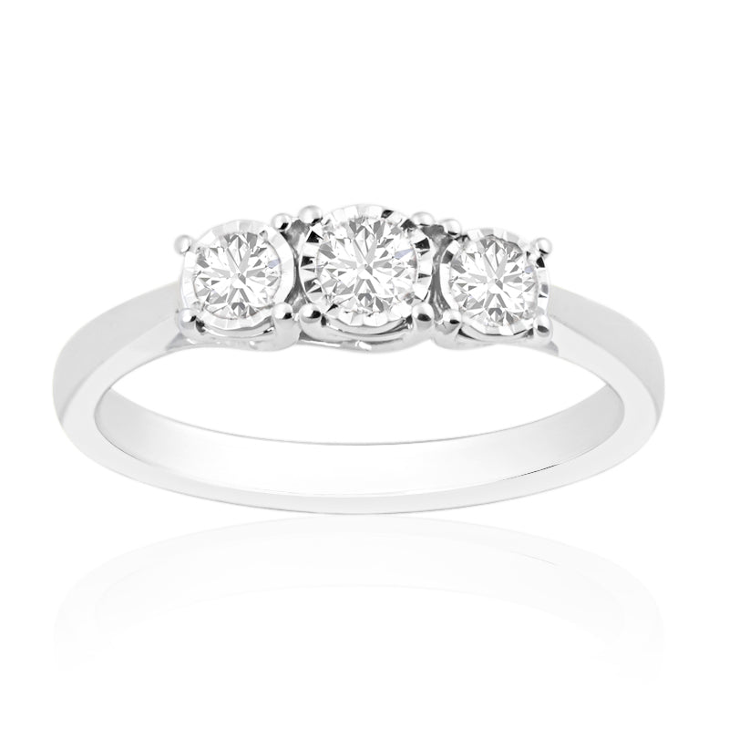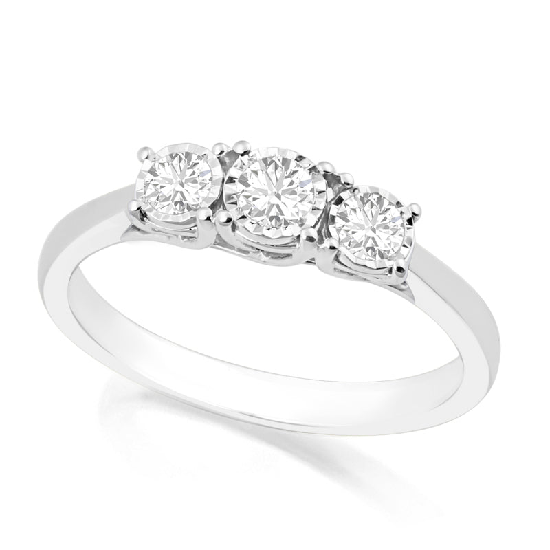Description: Diamond Three Stone Ring, Set with Three Brilliant Cut Diamonds in Star Bright Setting, Set in 9ct or 18ct White Gold