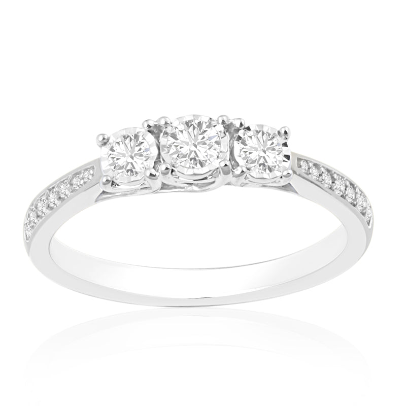 Description: Diamond Three Stone Ring, Set with Three Brilliant Cut Diamonds in Star Bright Setting & Diamond Set Shoulders, Set in 9ct or 18ct White Gold