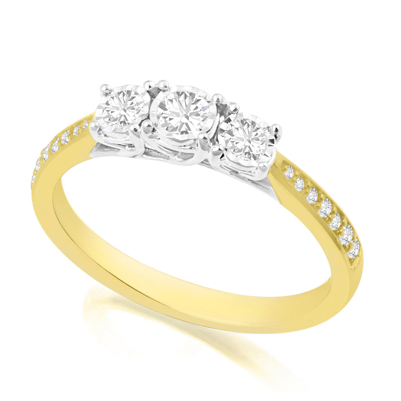 Description: Diamond Three Stone Ring, Set with Three Brilliant Cut Diamonds in Star Bright Setting & Diamond Set Shoulders, Set in 9ct or 18ct Yellow Gold
