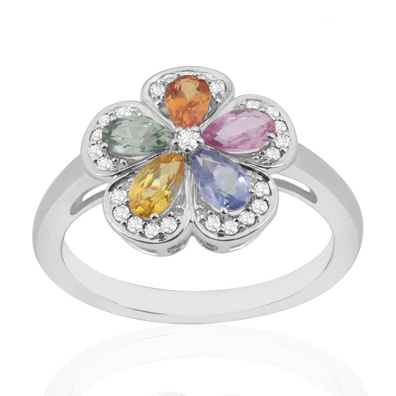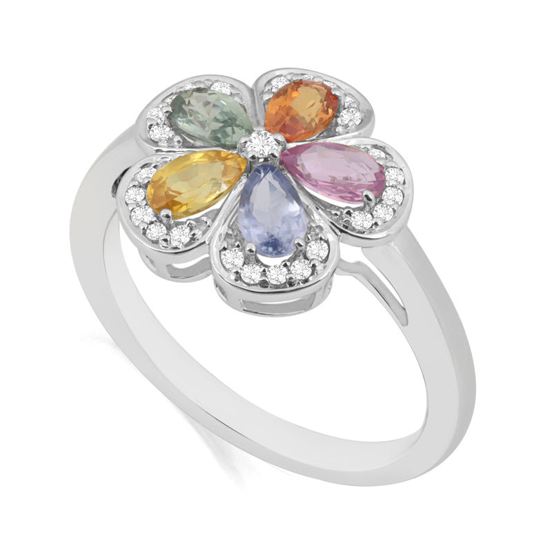 Description: Diamond & Colour Sapphire Ring, Set with Pear Cut Sapphires & Brilliant Cut Diamonds, Set in 9ct or 18ct White Gold