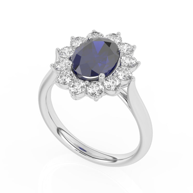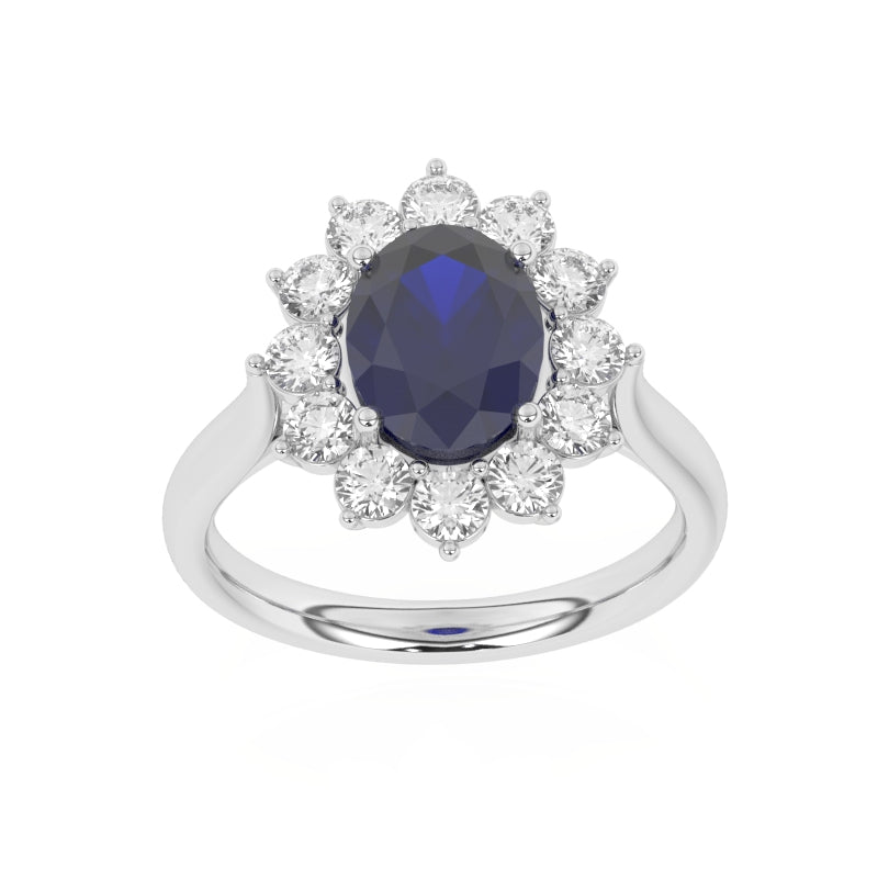 Description: Diamond & Sapphire Cluster Ring, Set with Oval Cut Lab Sapphire & Twelve Brilliant Cut Lab Diamonds, Set in 9ct or 18ct White Gold or Platinum