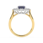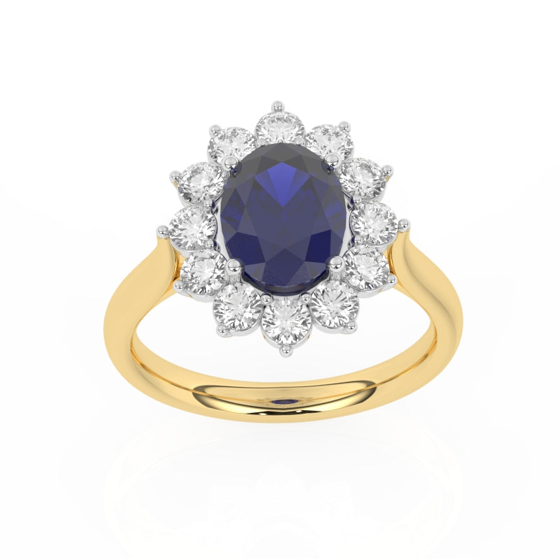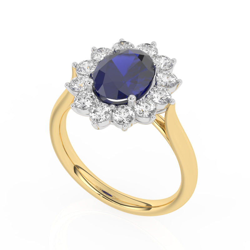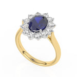 Description: Diamond & Sapphire Cluster Ring, Set with Oval Cut Lab Sapphire & Twelve Brilliant Cut Lab Diamonds, Set in 9ct or 18ct Yellow Gold